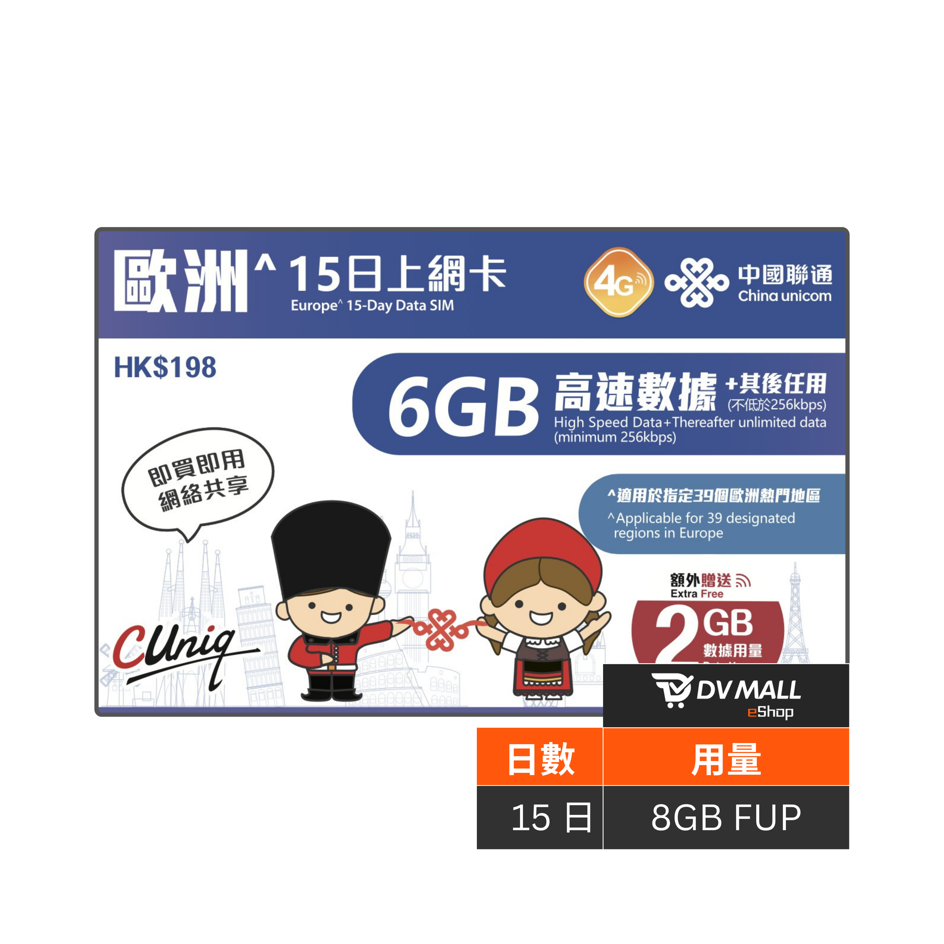中國聯通 4G 歐洲 | 15日6GB FUP 上網卡 | 優惠其間贈送流量