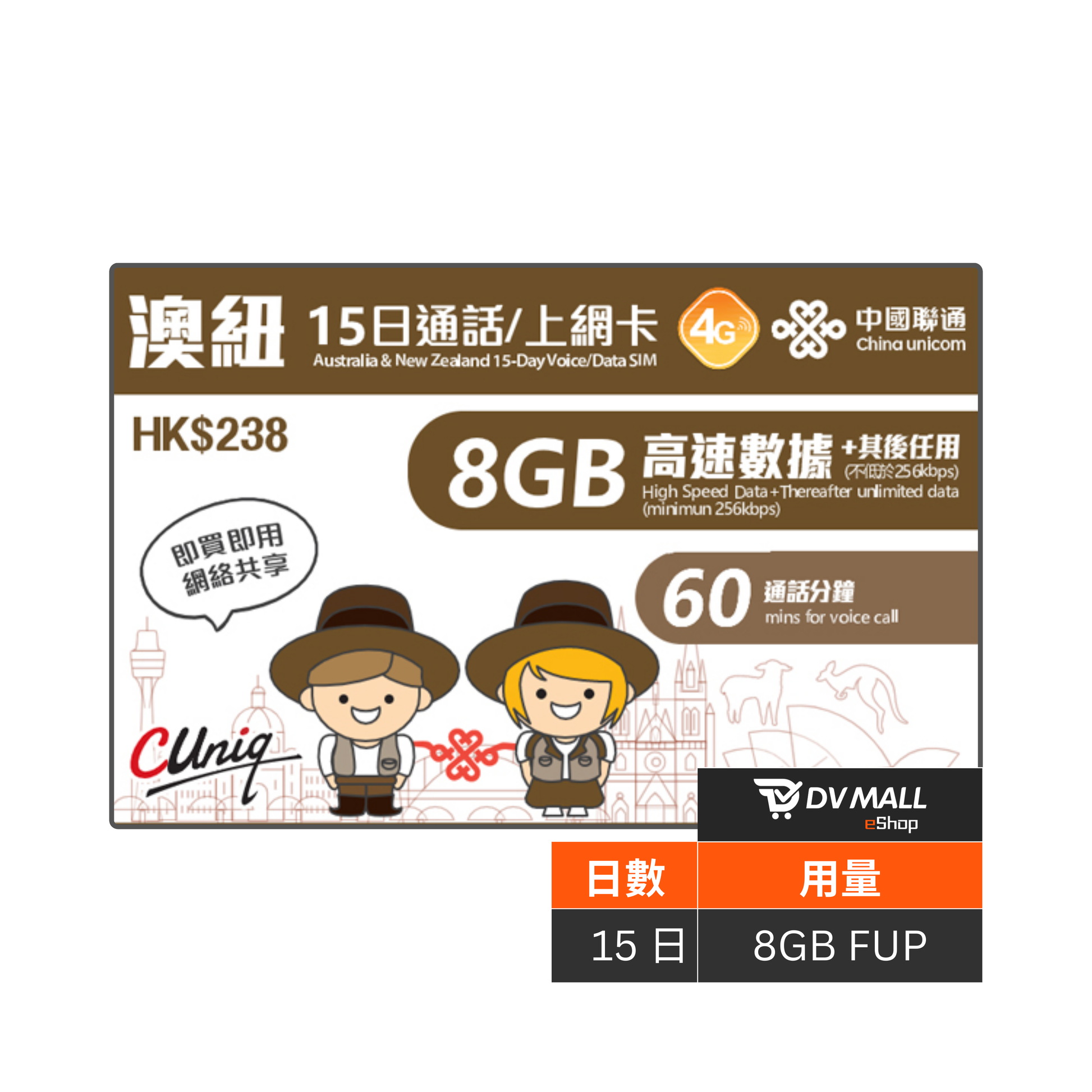 中國聯通 4G 澳紐 | 15日8GB FUP 上網卡 + 60分鐘通話 | 澳洲、 紐西蘭