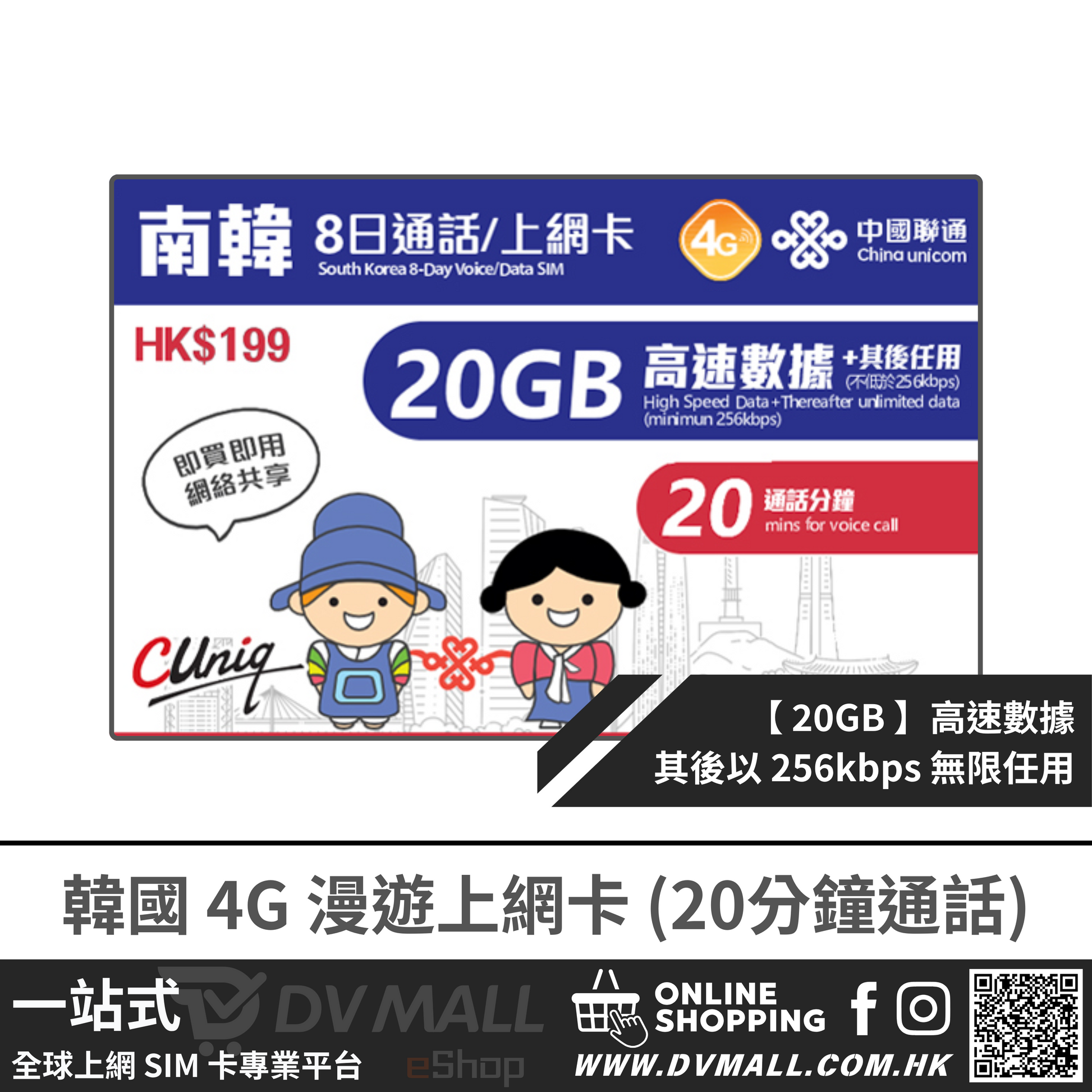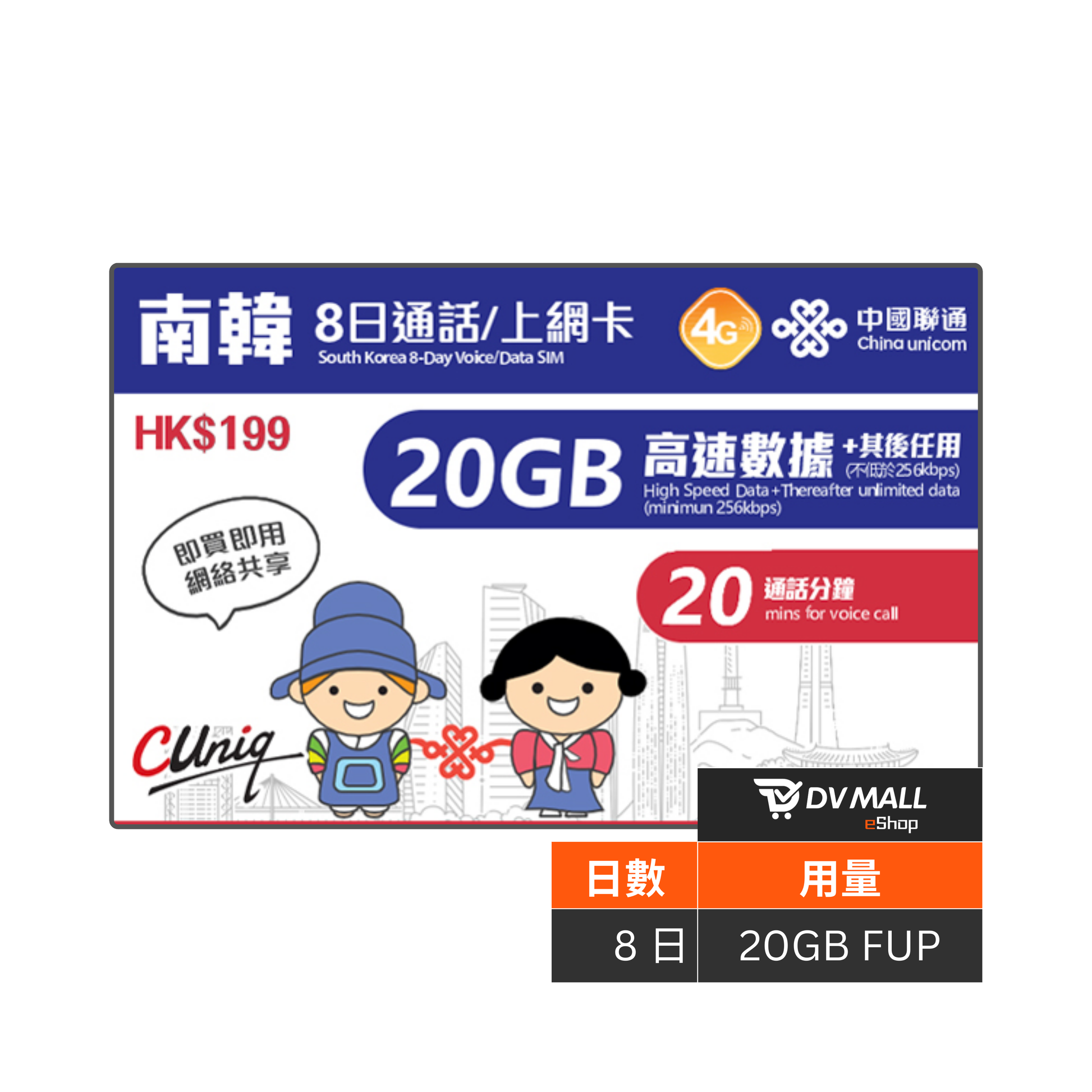 中國聯通 4G 韓國 | 8日20GB FUP 無限數據卡 + 20分鐘通話