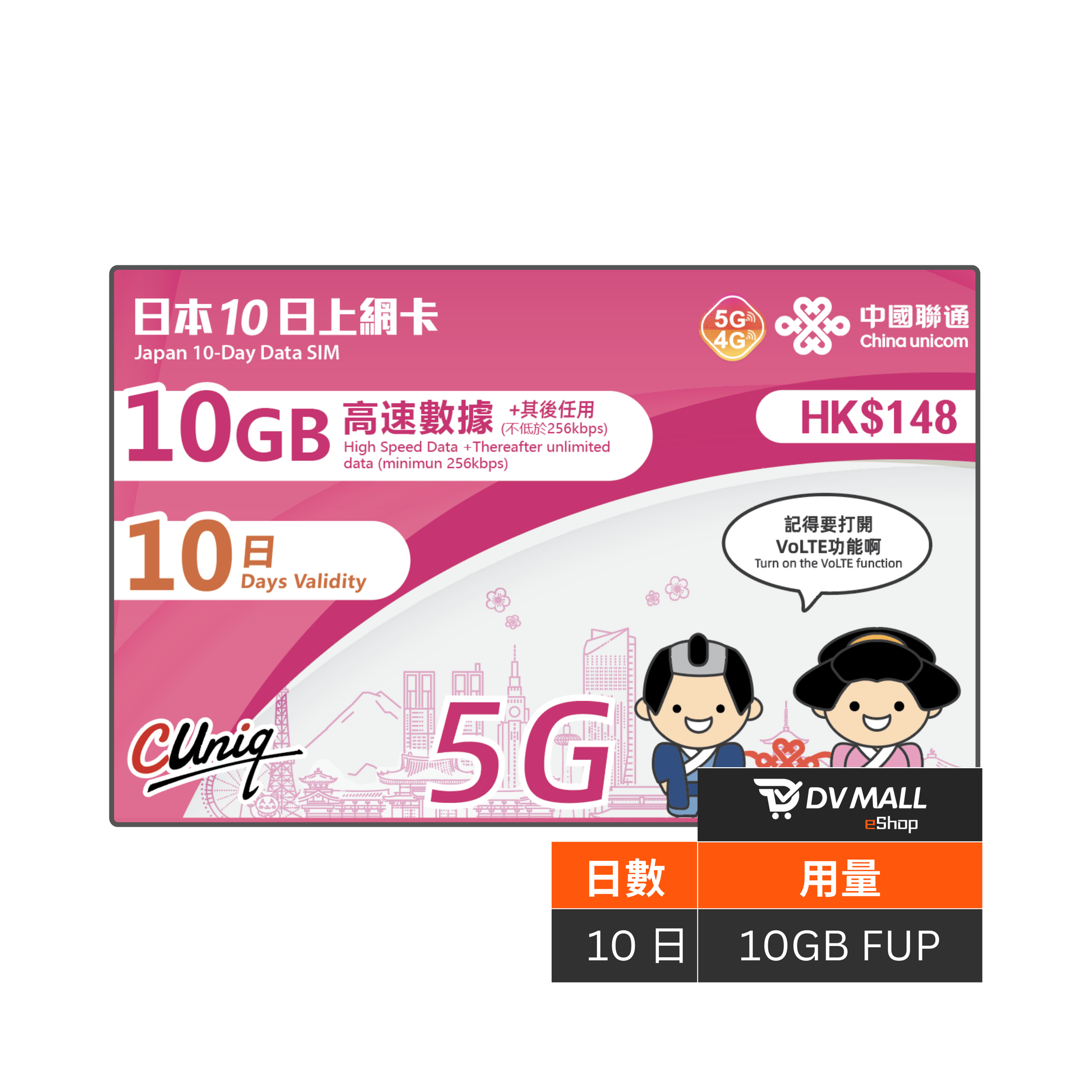 中國聯通 5G/4G 日本 | 10日10GB FUP 無限數據卡